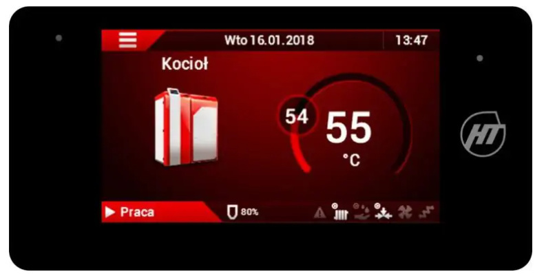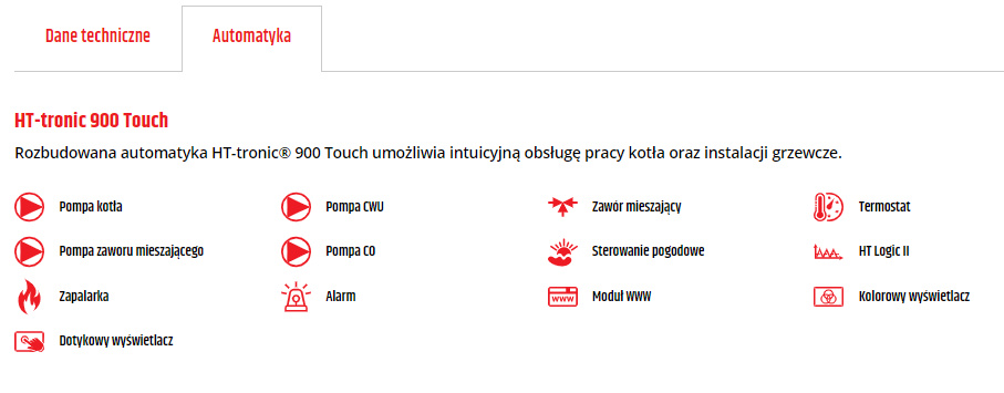 Sterowanie kotłem oraz instalacją grzewczą odbywa się poprzez dotykowy 5” wyświetlacz, wykonany w technologii pojemnościowej. Sterownik pogodowy HT-tronic 900 Touch steruje pracą 4 pomp oraz siłownikiem zaworu mieszającego. Automatykę można rozbudować poprzez podłączenie dodatkowych modułów. Sterownik współpracuje z panelem zdalnego sterowania, 2 termostatami pokojowymi oraz modułem internetowym. Posiada autoregulację HT-Logic III, która steruje pracą palnika, dobiera parametry pracy oraz moduluje moc w zależności od temperatury kotła.